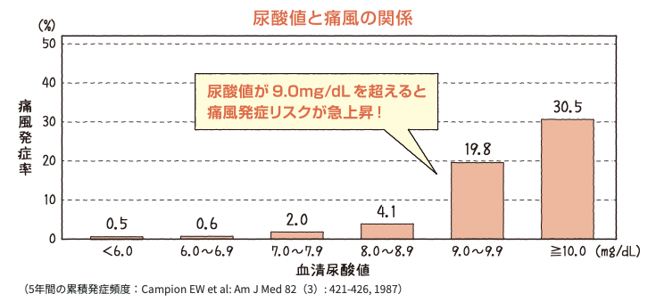 高尿酸血症(7.0mg/dL超)は、活性酸素を増やし血管を酸化させ動脈硬化を誘因。痛風発作の最初の2ヶ月は心筋梗塞や脳卒中を起こすリスクが通常の1.89倍。尿酸値6.0mg/dL以下を推奨